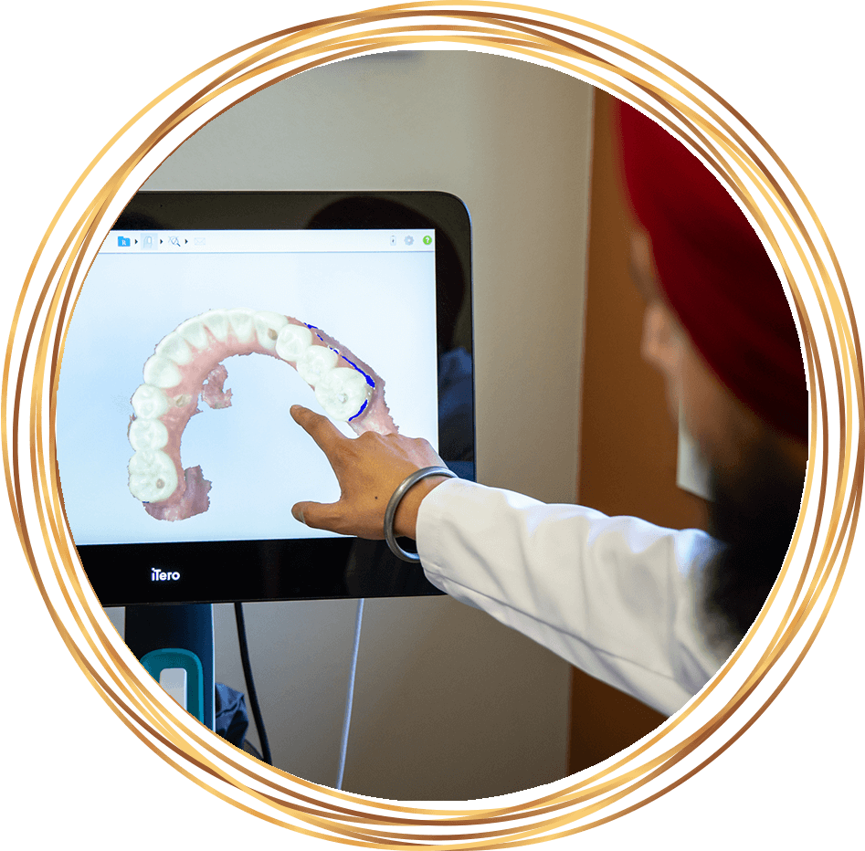 The first step is to remove a thin layer of tooth enamel (about half a millimeter) by buffing it gently. After this, digital impressions are taken, and your data is sent to a dental laboratory to fabricate your veneers. Porcelain veneers are customized to complement your gum and lip line, facial features, and skin tone. Temporary composite veneers are created on-site with our 3D printer, which you’ll wear until the final veneers return from the dental lab.